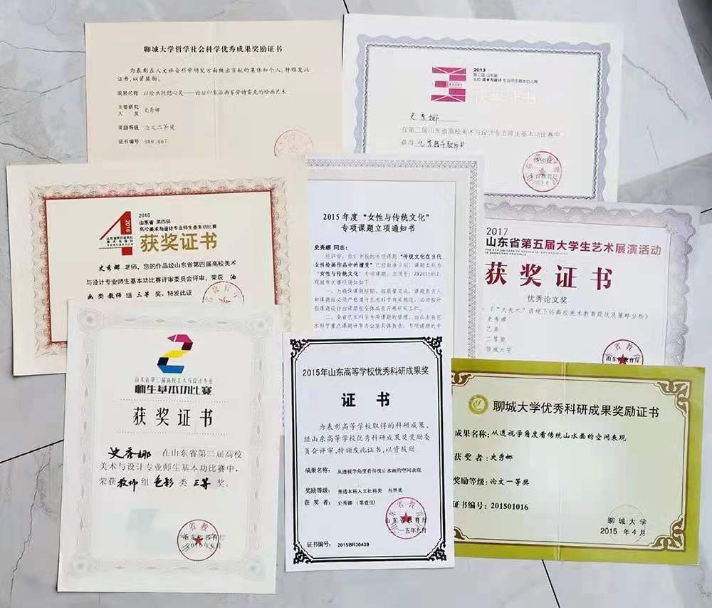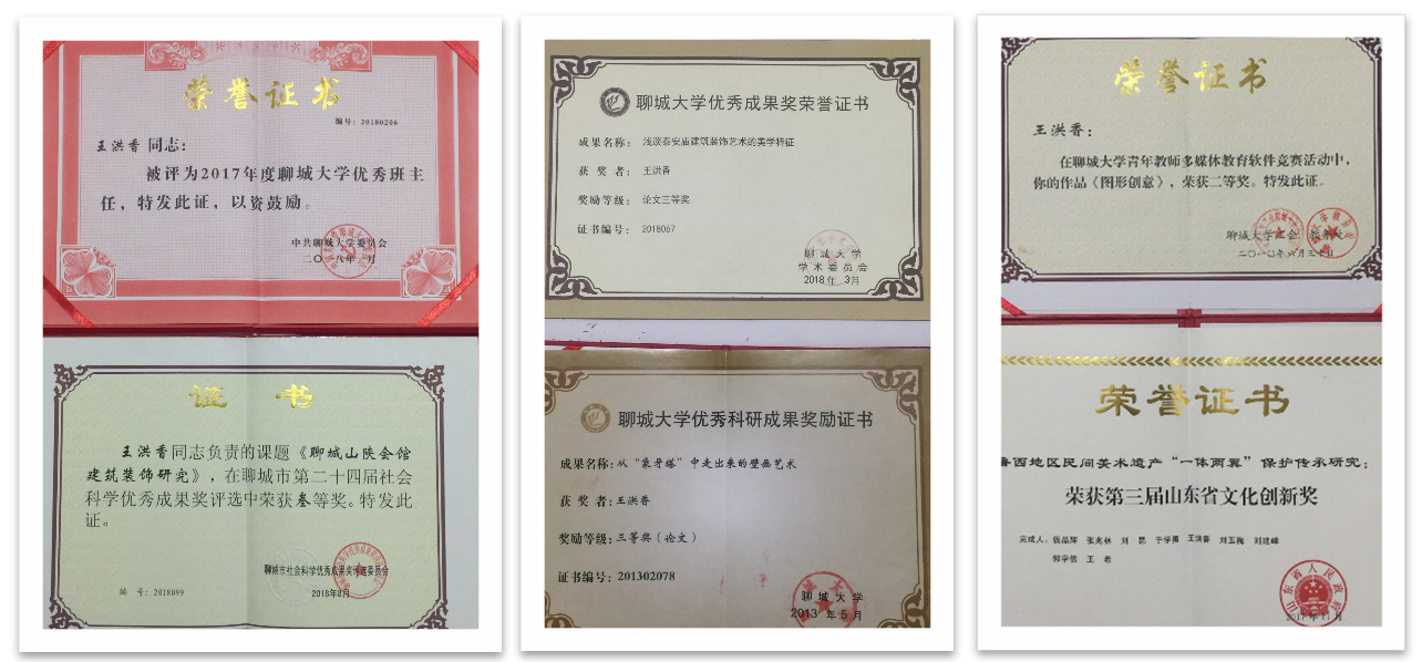 在山东省高校美术与设计专业师生基本功比赛、华东大奖、学院创意杯等省级以上专业比赛中荣获一、二、三等奖等各级专业奖项二十余项;在《出版广角》《新闻与写作》《艺术教育》等期刊发表文章14篇;主持山东省艺术科学重点课题和教育部产学合作协同育人项目各1项,参研省级、厅级教研、科研课题6项。