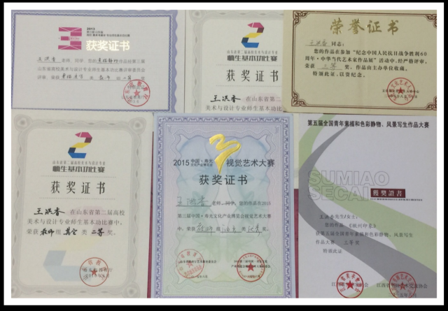 曾被评为山东省教委艺术教育委员会“十佳教师奖”、“山东美术创作荣誉奖”、校级“学科带头人”和“面向二十一世纪高层次人才培养工程对象”。2013年获批山东省教育厅社科科研立项《浪漫主义在中西绘画中的表现与研究》。中国美术家协会会员,秦中艺术交流中心高级顾问,北京神州艺龙文化交流有限公司高级画师,香港博雅艺苑文化发展有限公司签约画家。