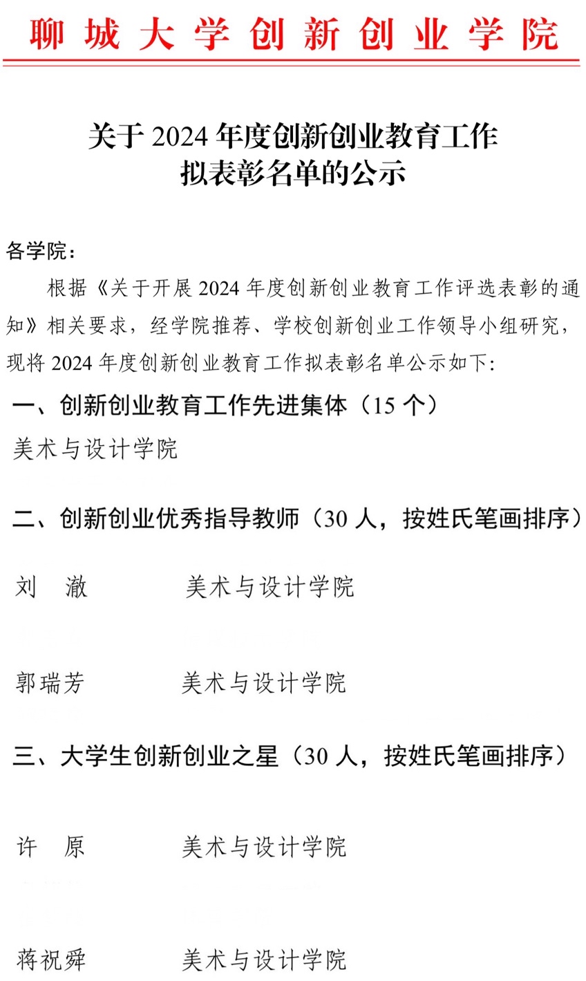 喜报:oety欧亿体育官网在2024年度创新创业教育工作中荣获多项表彰 作者:谢文涛 来源:oety欧亿体育官网 发布时间:2025-03-25 阅读次数: 公司在2024年度创新创业教育工作中取得优异成绩,学院获得创新创业教育工作先进集体,刘澈老师、郭瑞芳老师荣获“2024年oety欧亿体育官网创新创业优秀指导教师”称号,员工许原、蒋祝舜荣获“2024年oety欧亿体育官网老员工创新创业之星”称号。 (审核 孔德滕)