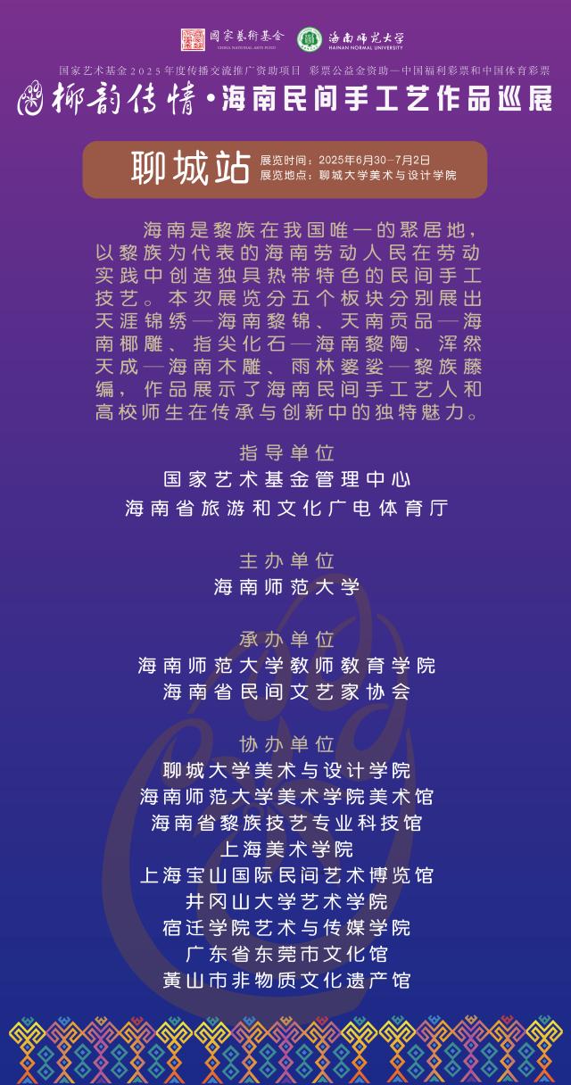 一场展现海南民间手工艺魅力的盛宴即将开启!国家艺术基金2025年度传播交流推广资助项目“椰韵传情・海南民间手工艺作品巡展”走进聊城大学!