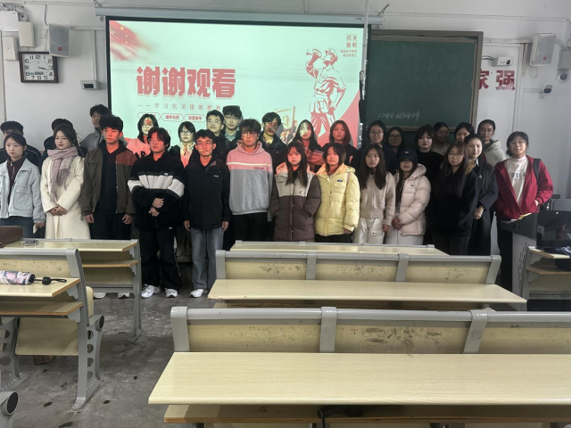活动伊始,活动主讲人围绕抗美援朝战争的历史背景、英雄事迹与时代价值,结合精心制作的PPT,帮助大家铭记这段峥嵘岁月。接着,为进一步增强教育效果,活动还设置了“看图猜猜猜”趣味小游戏、鉴赏经典红色影片片段以及进行“抗美援朝知识知多少”知识竞赛等,从而引发大家的精神共鸣。活动最后,活动主讲人邀请同学们发表自我感悟,在紧张而热烈的氛围中加深了对历史事件、英雄人物和精神内涵的理解。